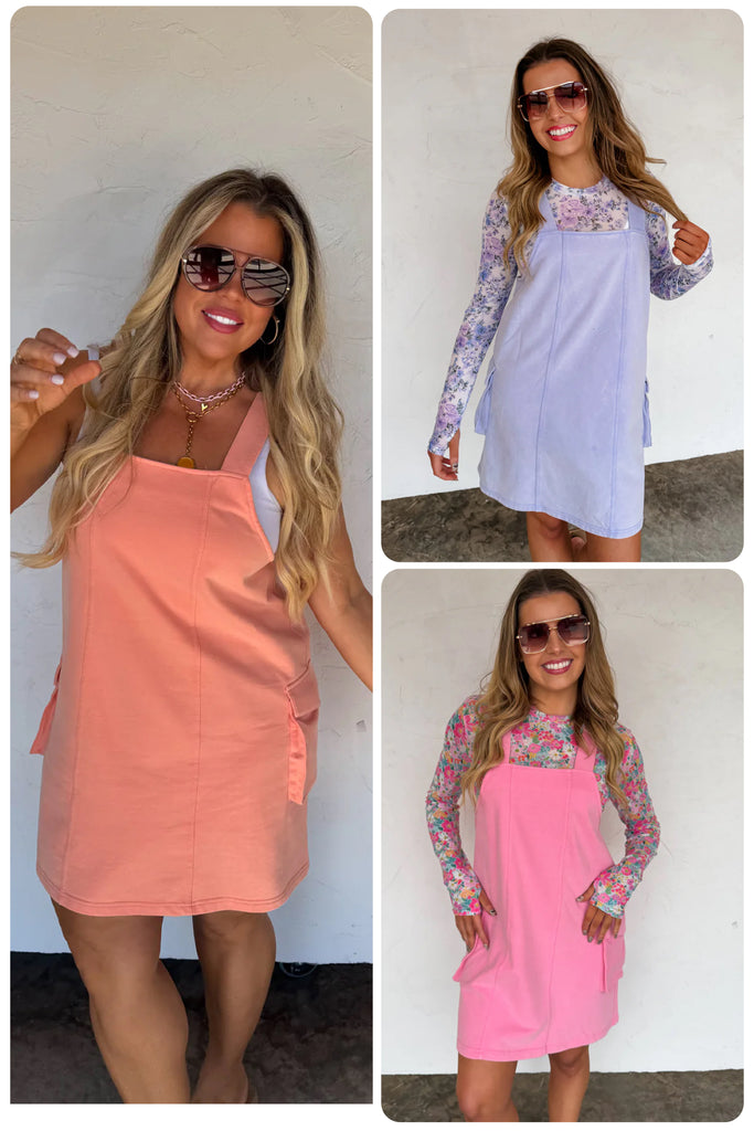 NEW SPRING COLORS! Trust us when we tell you this soft washed terry overall dress will be your GO to outfit! You're gonna want to live in this cute thing! Slip it on and you're ready to go! Ultimate softness with a washed terry fabric and large side pockets! Grab these quick! Like wearing a comfy sweatshirt!