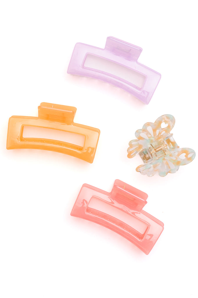 Get it together with our Large Jelly Claw Clip Set of 4. Whether you're running out the door in a hurry or just need to keep it together, this set has you covered. Featuring the timeless Ivory Butterfly Claw Clip and our playful Jelly Rectangle Clip in Watermelon, Sherbet and Lavender, it's all you need to keep your hair looking effortlessly chic and get day on track.
