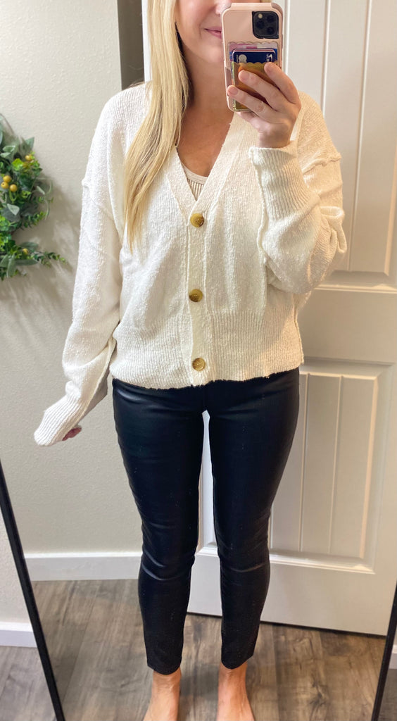 A classic button-down cardigan with an oversized, slouchy fit that dresses up beautifully. Pair with faux leather leggings, a dress👗 , or denim 👖 !
