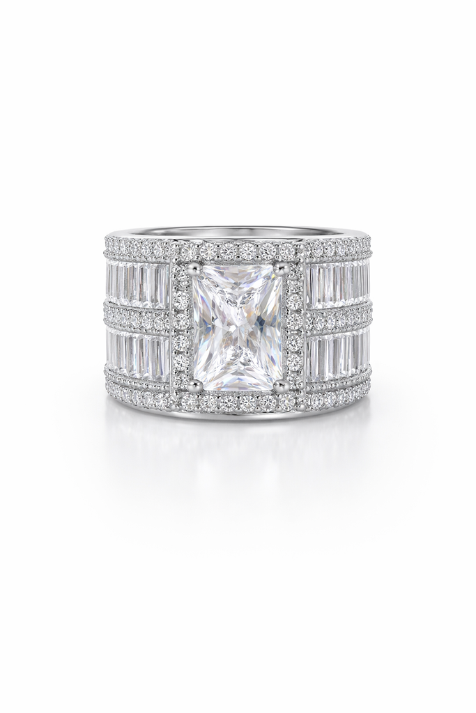 The Lisa Art Deco Statement Ring channels vintage glamour with its striking geometric design. A brilliant princess-cut cubic zirconia center stone takes center stage, surrounded by a luminous halo and intricate rows of baguette and pavé-set stones that create dimensional sparkle from every angle. The wide silver-plated brass band delivers a luxurious, high-impact presence while maintaining the symmetrical elegance characteristic of Art Deco aesthetics. This expertly crafted piece is engineered to refract light beautifully, making it an ideal choice for those seeking a bold right-hand statement ring or a show-stopping focal point for any ensemble.