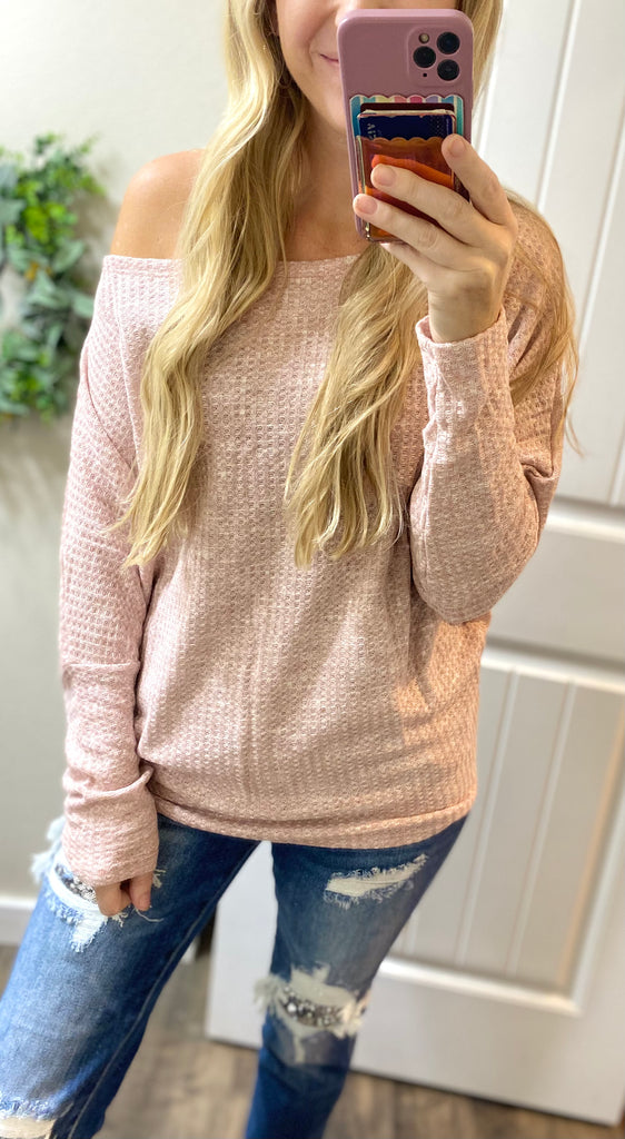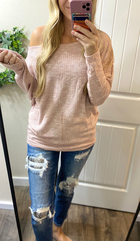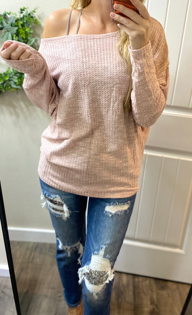 Soft waffle knit with a wide boat neckline, dolman sleeves, and a relaxed fit.